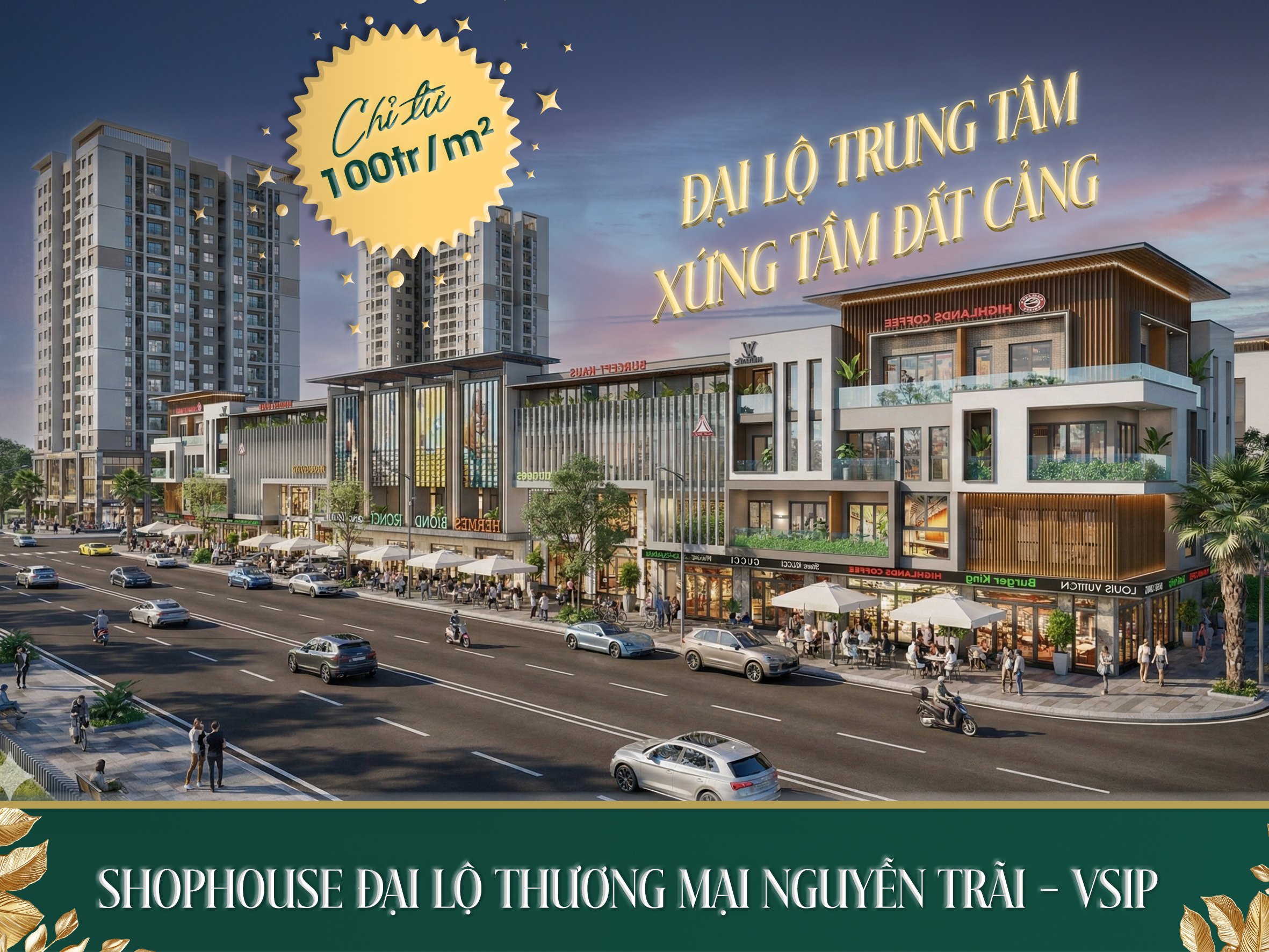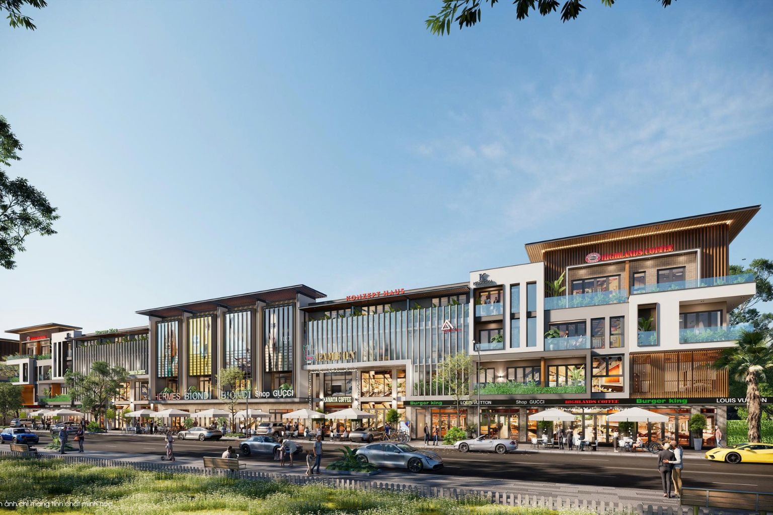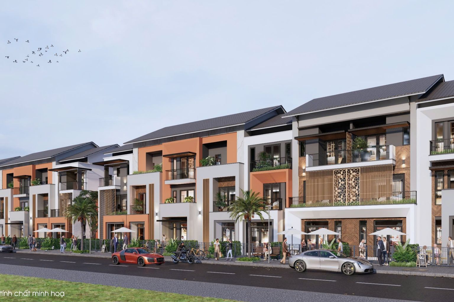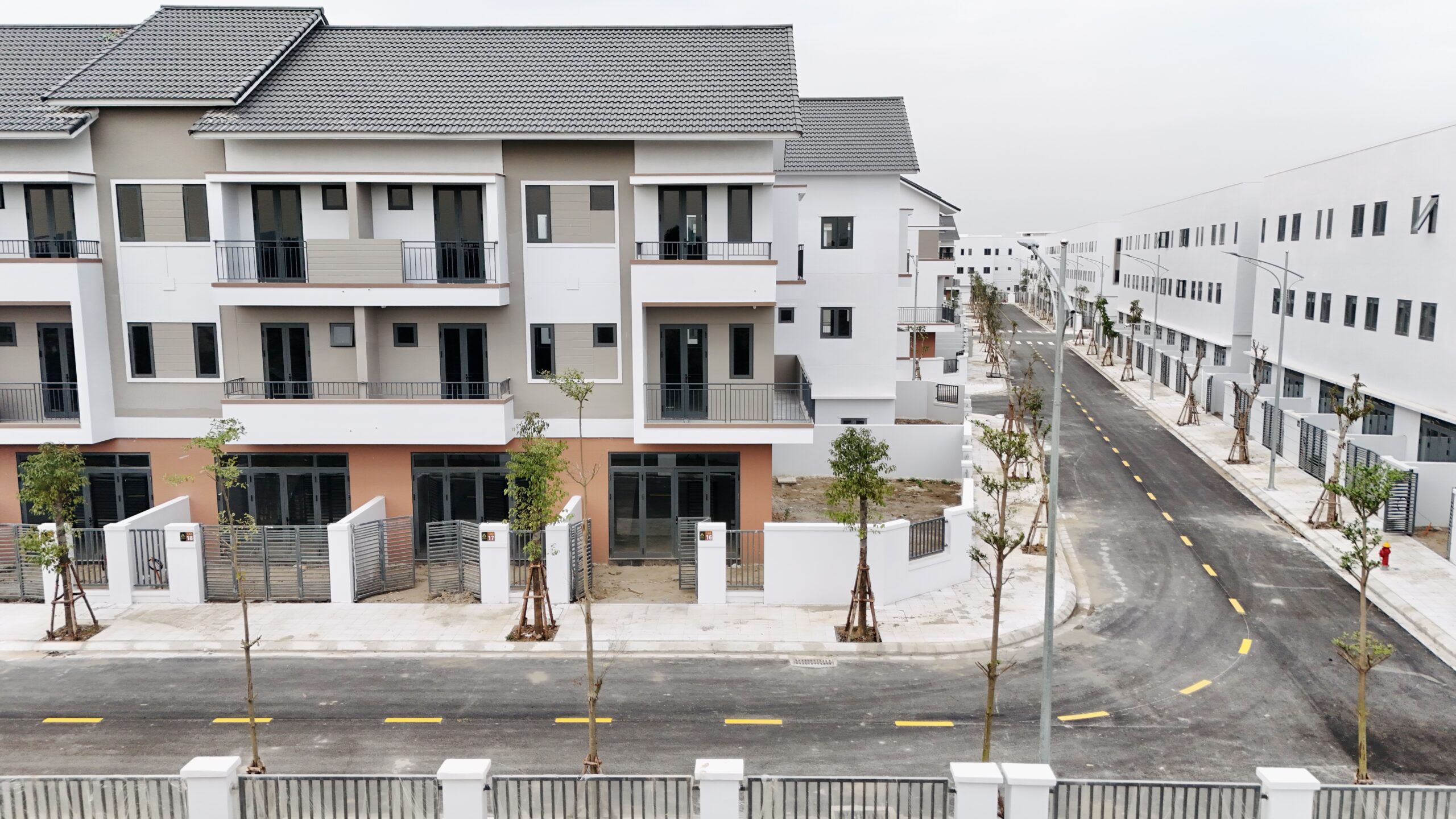 - Các dãy Shophouse mặt đại lộ đã hoàn thiện xong phần thô và mặt ngoài, tạo nên diện mạo sang trọng.